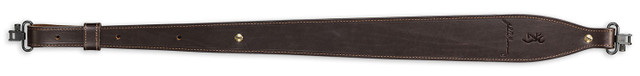 The JMB signature sling is made from top grain leather and has a suede backing, edge stitching, brass hardware, and features the signature of John M. Browning. Metal sling swivels are included.