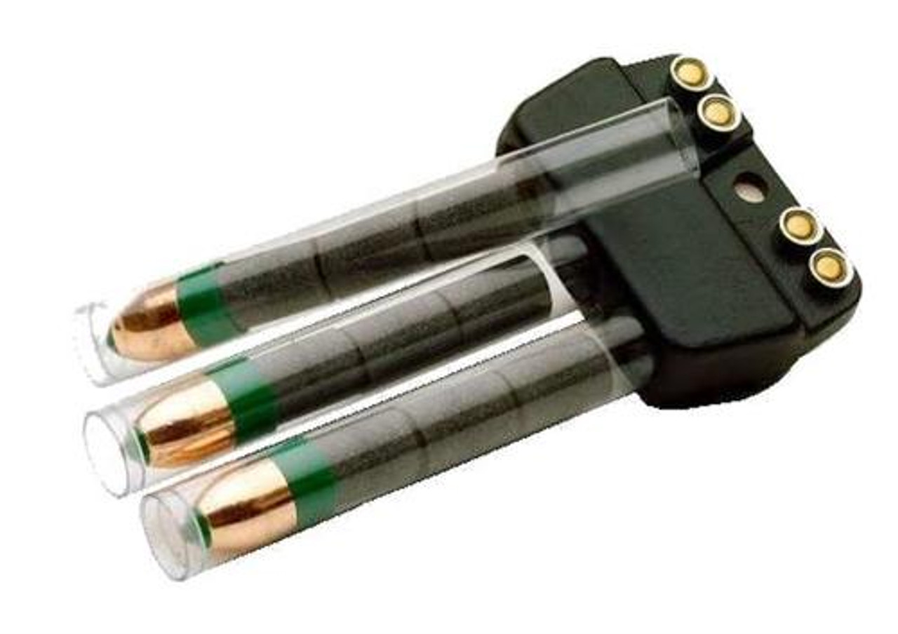 CVA’s powerbelt speedclip holds three loaders, each with a powerbelt bullet and magnum pellet charge plus four 209 primers.