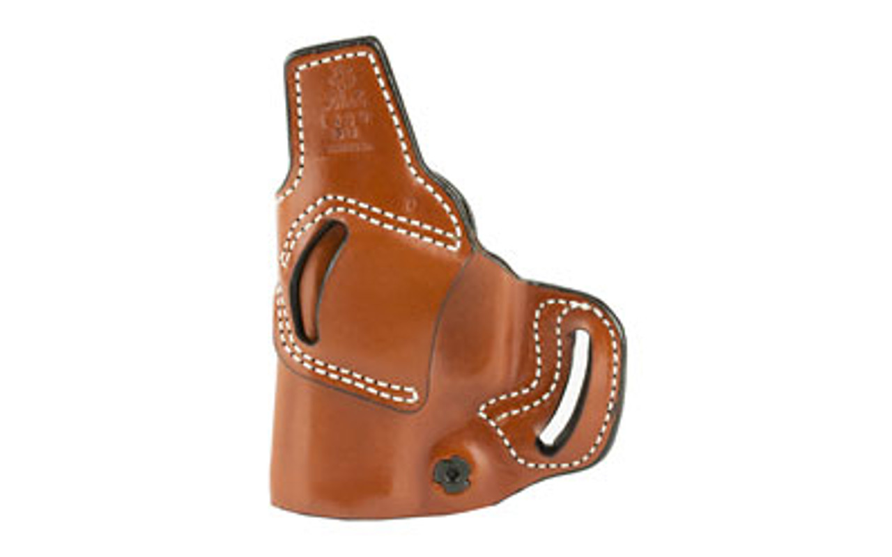 Osprey is a trailing slot OWB/IWB holster built from premium tan saddle leather. The belt slots will fit belts up to 1 1/2″ wide. The IWB strap is “cantable” and easily removed without tools.