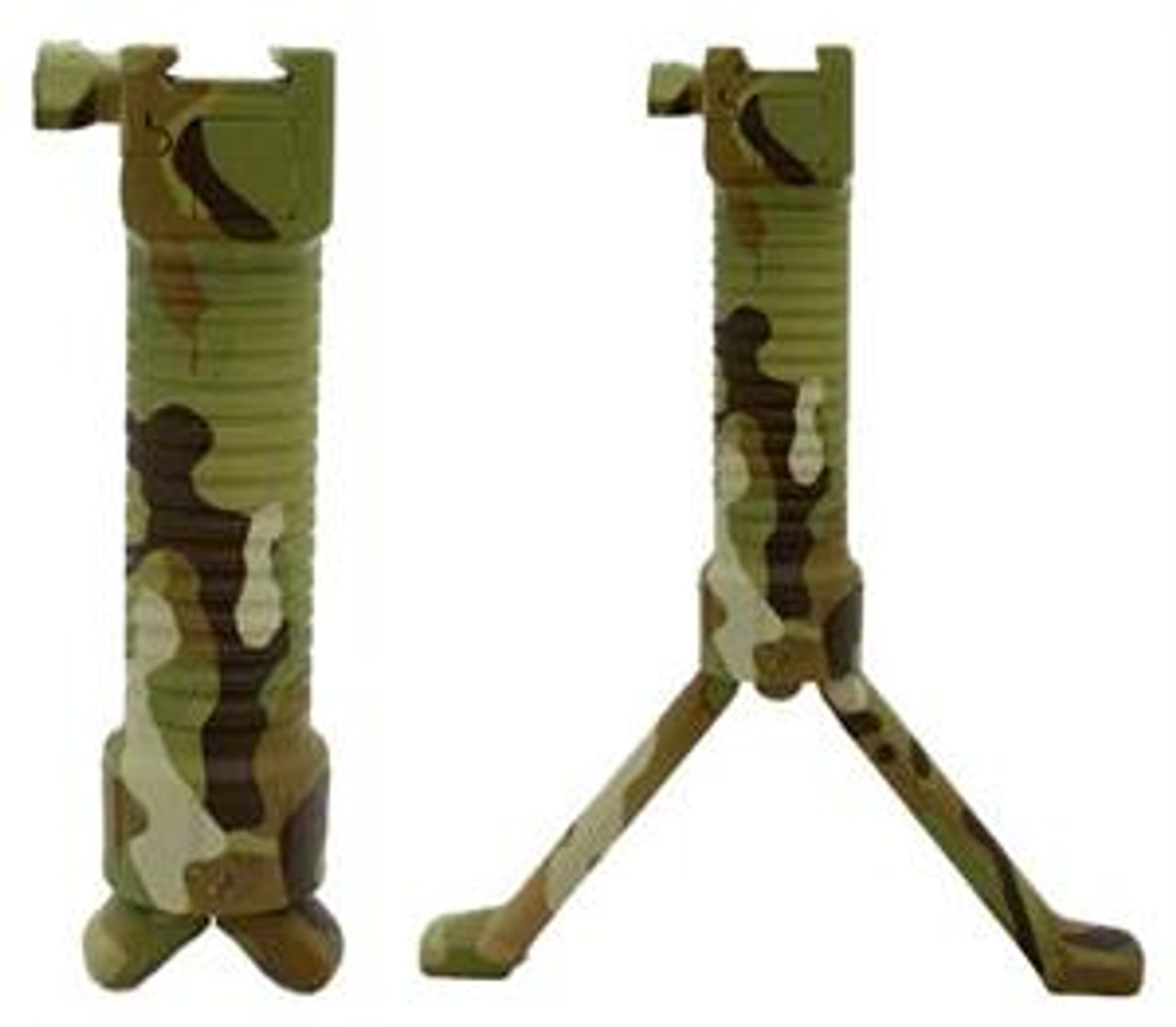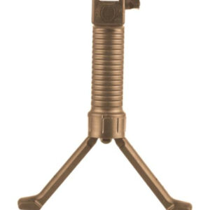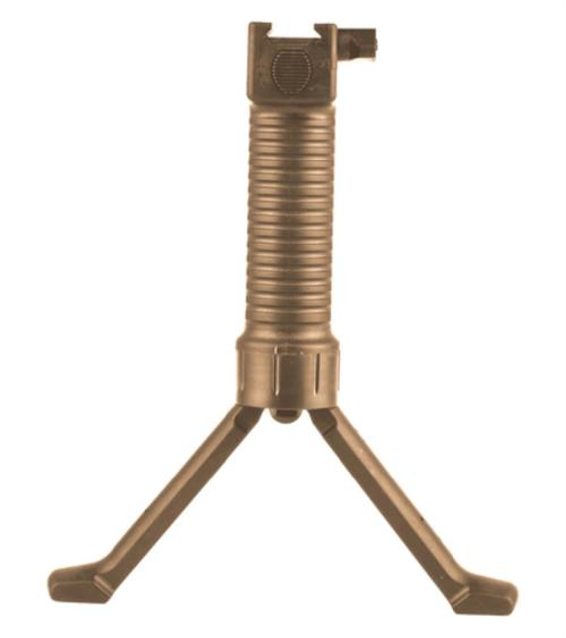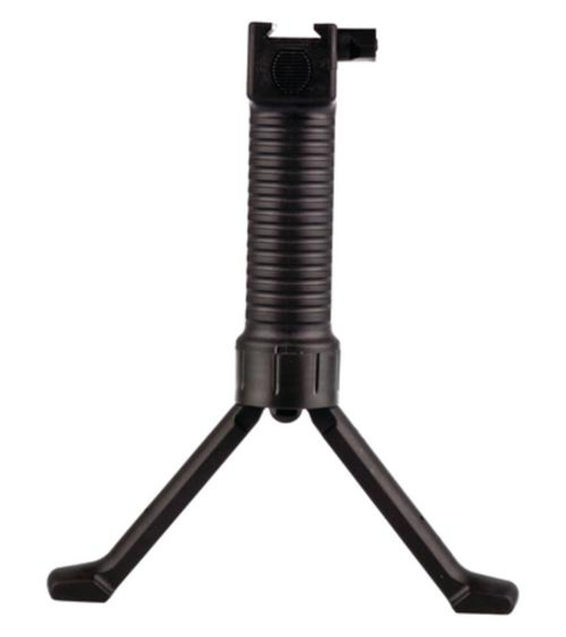Dual-function vertical grip locks to the bottom accessory rail on your tactical rifle’s forend to give enhanced control during CQB operations, plus provides a stable bipod rest for precise long-range fire. The grip’s hand-filling contours and deep grooves provide a solid purchase even when your hands are wet. Hit the large, deeply grooved release button on the front of the base and a powerful spring deploys the bipod legs instantly. Conveniently placed for activation with the index finger, the button sits flush with the surrounding surface to prevent accidental deployment. Extended legs provide sufficient elevation for a standard 30-round magazine to clear the ground, and will not snag on brush, vehicle interior, or other gear when retracted. Injection-molded polymer with reinforced steel leg inserts for extra strength. Steel cross-bolt with easy-grip thumbscrew locks directly to any MIL-STD 1913 Picatinny rail to ensure a rock-solid fit.
