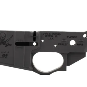 Spikes Lower Receiver Stripped-Calico Jack Logo -Strike Fear with the Calico Jack . Add some attitude to your next AR build with the Spike’s Tactical Calico Jack Stripped Lower Receiver. Featuring the iconic pirate skull and crossed swords engraving, this mil-spec lower is a favorite among enthusiasts who want their rifle to stand out—without compromising performance.